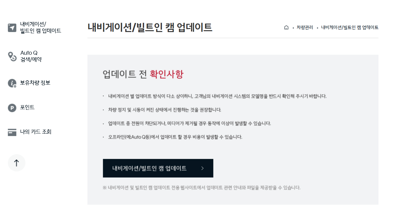 내비게이션/빌트인 캠 업데이트 업데이트 전 확인사항 내비게이션 별 업데이트 방식이 다소 상이하니, 고객님의 내비게이션 시스템의 모델명을 반드시 확인해 주시기 바랍니다. 차량 정지 및